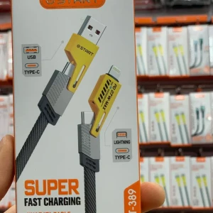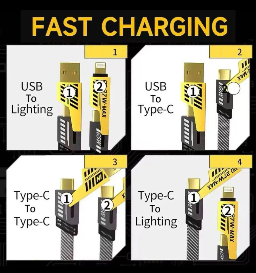 كابل شحن ونقل بيانات "4 في 1" يوفر شحنًا فائق السرعة يصل إلى 65 واط (و PD 27W)، ومصمم بشكل متين. يتميز هذا الكابل بطول 100 سم ويحتوي على أطراف USB وType-C وLightning، مما يجعله متوافقًا على نطاق واسع مع مختلف الأجهزة