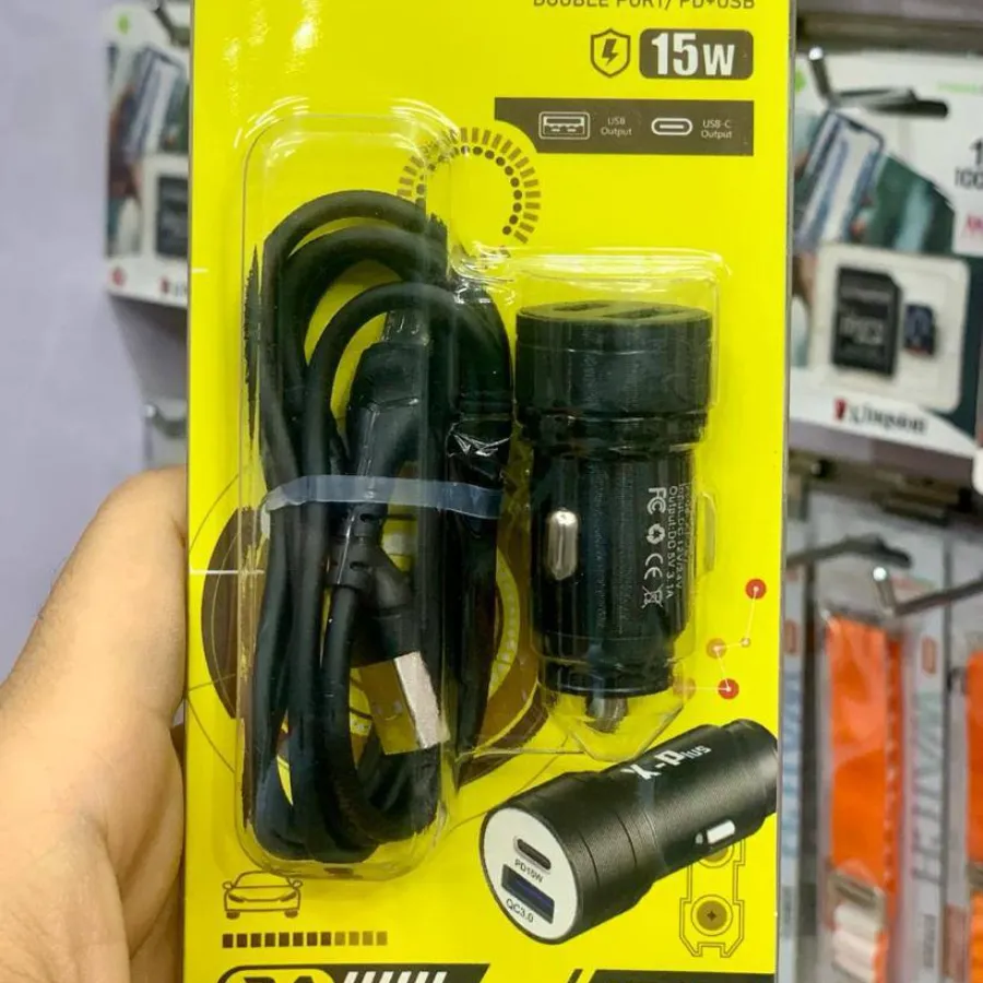 شاحن سيارة مزدوج المنافذ بقوة 15 واط يدعم الشحن السريع 3 أمبير، ويتميز بمنفذي PD و USB-A. يأتي هذا الشاحن مع كابل مرفق، مما يجعله حلًا عمليًا وفعالًا لشحن الأجهزة المتعددة في السيارة